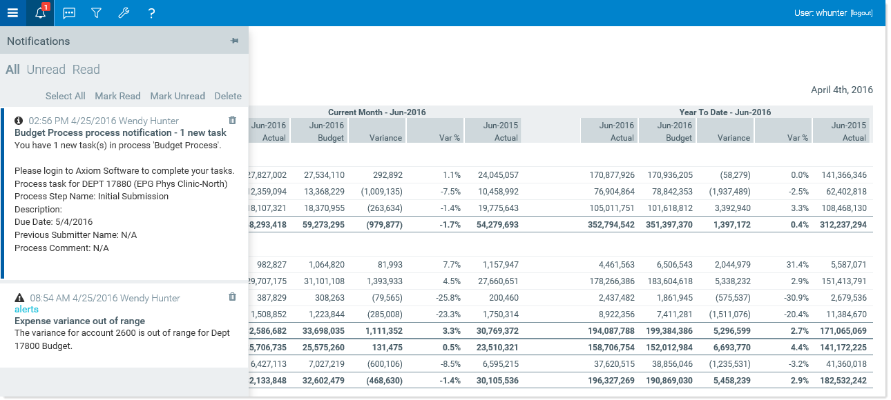 NOTE: All notifications displayed in the Notifications panel are also available in the Notifications task pane of the Desktop ClientGeneral term for using either the Excel Client or the Windows Client, both of which are installed to the user's desktop.. Both areas read from the same source of notifications, and edit the same source as well. So if you mark a notification as read in one area, or delete a notification from one area, the other area will reflect these changes. For more information, see Viewing notifications in the Desktop Client.