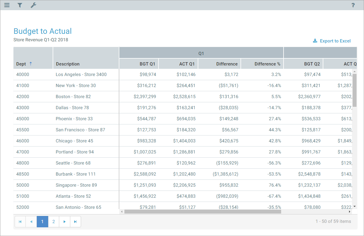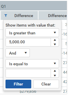 Some columns may allow filtering the grid by the column data. For example, you might want to filter a data column to hide zero-value records, or to show all records above or below a certain value. You might want to filter a dimension column to hide or show certain dimensions (such as departments, accounts, and so on). The report creator determines whether a column is enabled for filtering.