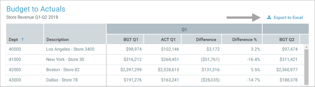 If the data grid has been configured to allow exporting data, an Export to Excel button displays at the top right of the grid. You can click this button to export the grid data to a Microsoft Excel spreadsheet (XLSX file). The report creator determines whether exporting to spreadsheet is enabled.