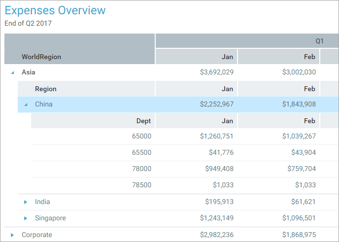 Data grids may be configured to show data in hierarchical groups. For example, you may initially see the top level data by WorldRegion, then expand a world region to see the Region data within it, then expand a region to see the individual departments in that region. The report creator determines whether a grid is grouped or not, as well as the grouping levels.