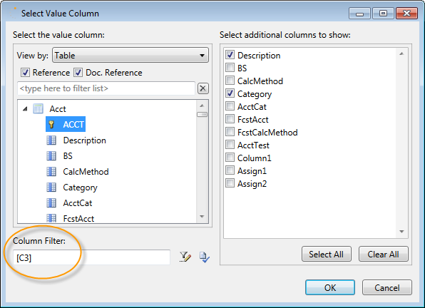 In this example, the column filter is being read from cell C3. If cell C3 contains Acct.Category='Revenue', then when the form is presented to the user, the account list will be filtered to only show revenue accounts.