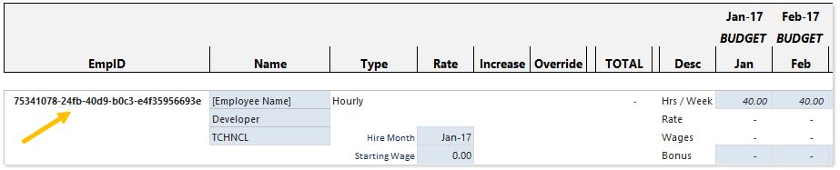 GUID variables can be used to generate a globally unique identifier (GUID) when a calc method is inserted. This is a special variable type that does not display to the user in the Calc Method Variables dialog—it is only used to generate the ID and place it into the inserted calc method. For example, when inserting calc methods for planning new hires, you may want to generate a unique ID for each new hire.