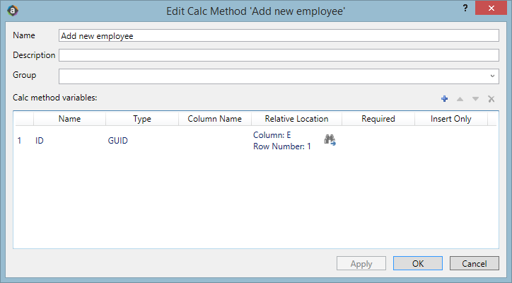 When the user inserts this calc method, no variables dialog displays to the user. Instead the calc method is directly inserted, and a GUID is generated and placed in column E, in the first row of the calc method.