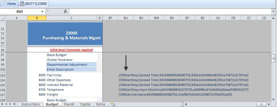 This example is for a single-row calc method named Input Monthly. For multiple-row calc methods, there are separate [CMStart] and [CMStop] tags.