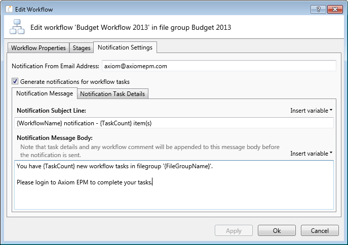 On the Notification Message sub-tab, enter the text to use for the subject line and the message body of the email. To use a workflow variable, type the variable name or use the Insert variable menu.