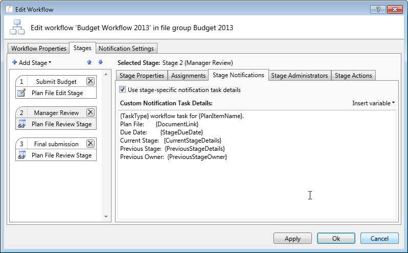 Workflow variables are available for use in the notification emails, so that you can easily include workflow information in your customized text. For example, there are variables to return the current stage name, and the stage due date.