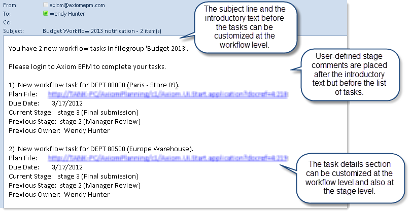 You can customize the text of workflow notification emails, for the entire workflow and/or on a per stage basis.