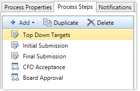 The following screenshot shows an example plan file process for a budget process. When the process is active, each plan file in the file group will progress through these steps independently.