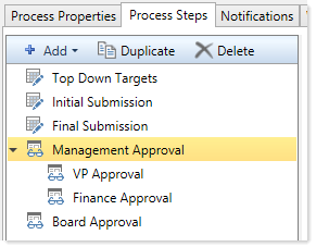 Alternatively the process can use the Multiple Approvals step for concurrent approvals. In the following example, The Management Approval item is a Multiple Approvals step with two Approval sub-steps. When the Multiple Approvals step becomes active, both the VP and Finance approvals will become active at the same time, and can be completed concurrently. Once both owners have approved the step, the plan file moves on to the final Board Approval step.