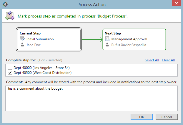 End users can use the Process Routing web page to review the process history of a particular plan file. If the user is the current step owner, they can also complete the task from the page. This page can be accessed from the Process Summary component, or you can include a link to the page on a form-enabled Home file or other Axiom form.