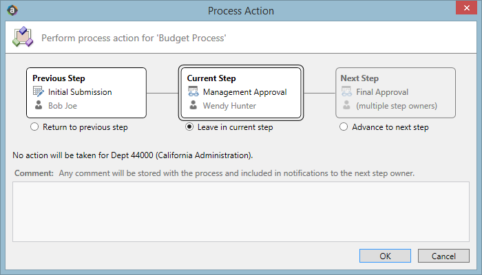 In the following example, the user is the owner of an Approval step, so the user has the option to advance the plan file to the next step (approve) or return it to a previous step (reject). If the step is an Edit Plan File step, then the user only has the option to advance to the next step.