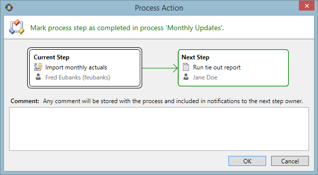 Once the user has completed the task to their satisfaction, they can mark the step as complete by clicking the button in the task pane. This opens the Process Action dialog, so that the user can confirm that they want to complete the step, as well as enter any step comments.