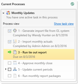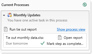 This setting is disabled by default, which means that step owners only have access to the Task View in the Process task pane. The Task View displays the currently active step as follows:
