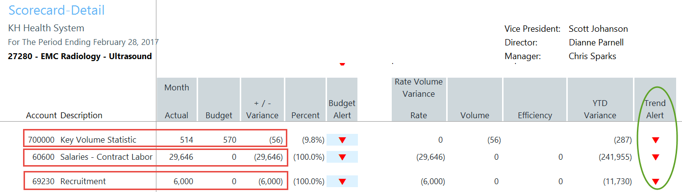 Review the Summary Level information, then look to the detail for further explanation regarding variances. Determining the account numbers with variances will provide the link to the detailed information on the AP, AR, MM, etc. reports that support the expense. As in our example above, Salaries and Other Expenses resulted in a Red Flag Variance, specifically within accounts 60600 Salaries-Contract Labor and 69230-Recruitment.