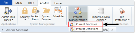 On the Admin tab, in the Workflow group, click Process Management > Current Processes.