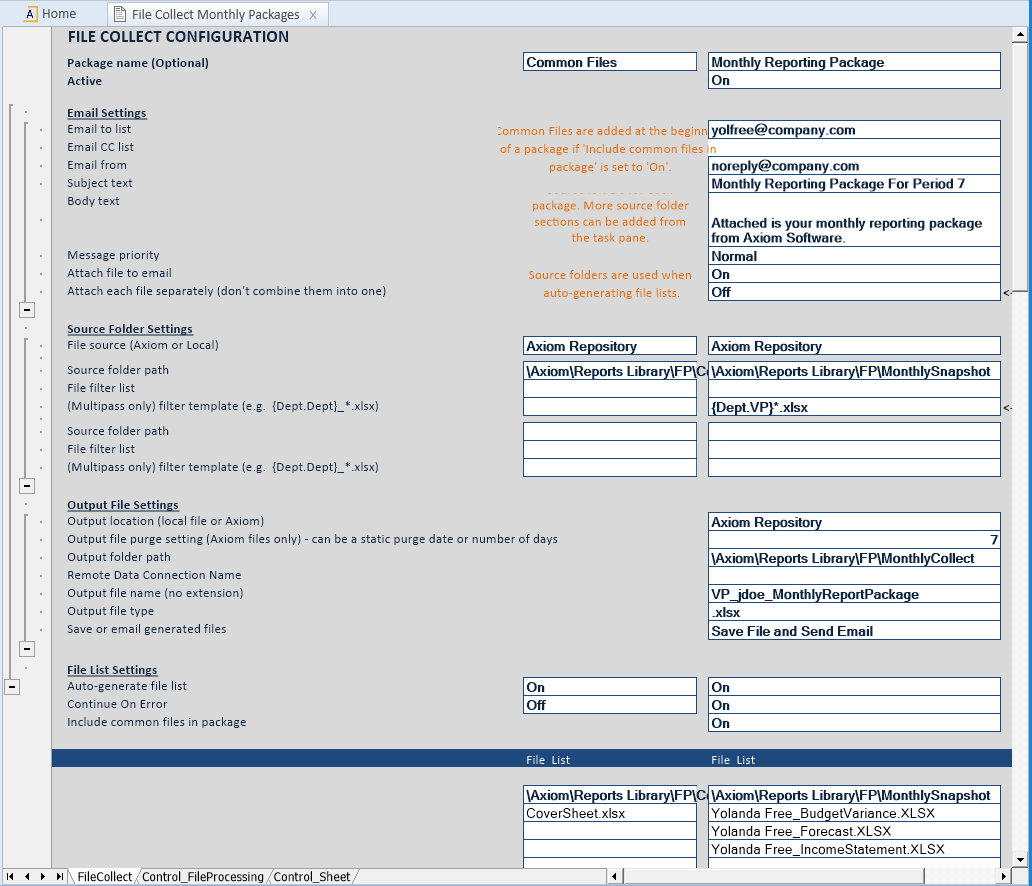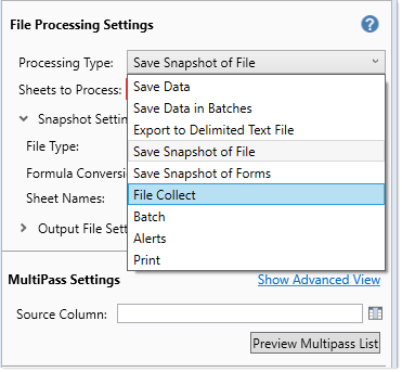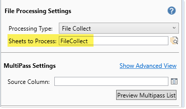 NOTE: On the File Processing Control Sheet (Control_FileProcessing), the only settings that apply to file collect are the Processing Type, the Sheets to Process, and the multipass settings. All information relating to the file collect packages, including the output file and email details, are defined on the File Collect Configuration sheet instead of the File Processing Control Sheet.