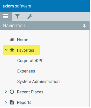 Your favorites list displays any favorites that you have saved in the Web Client. It also displays web-enabled favorites that you have saved in the Desktop Client (meaning favorites to individual Axiom forms or web reports). Other favorites saved in the Desktop Client do not display in the Web Client (including folders saved as favorites, even if the folder contains web-enabled files).