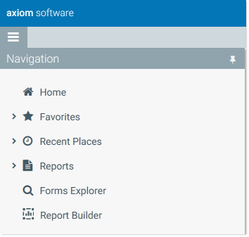 Axiom Capital Planning provides a set of standard navigation links that show by default when you are in the Web Client. The previous screenshot shows the standard navigation links. These links provide access to your favorites, recent places, web-enabled reports and forms, and the Report Builder. The standard navigation links can be customized, so each customer's system may look different. Navigation links can only be customized by administrators using the Desktop Client. For more information on how to customize the panel, see Defining navigation links for the Web Client Navigation panel (Desktop Client Help). |