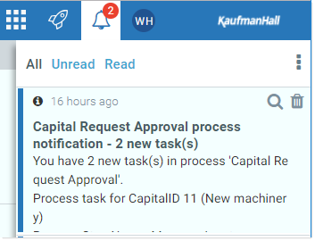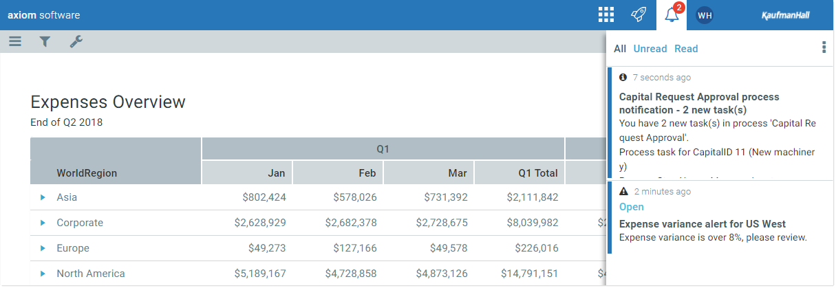 If you receive a notification in Axiom Capital Planning, you can view it in the Notifications panel. Notifications can come from the following sources: