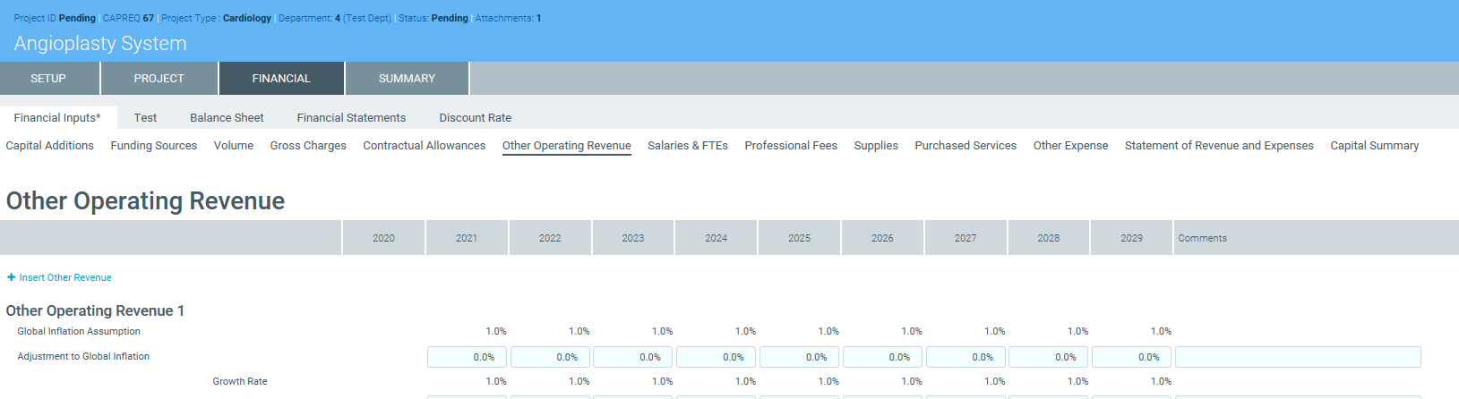 Use this tab to add additional operating revenue not related to a patient (i.e. gift shop) by entering a first year amount and then applying a growth rate to it.