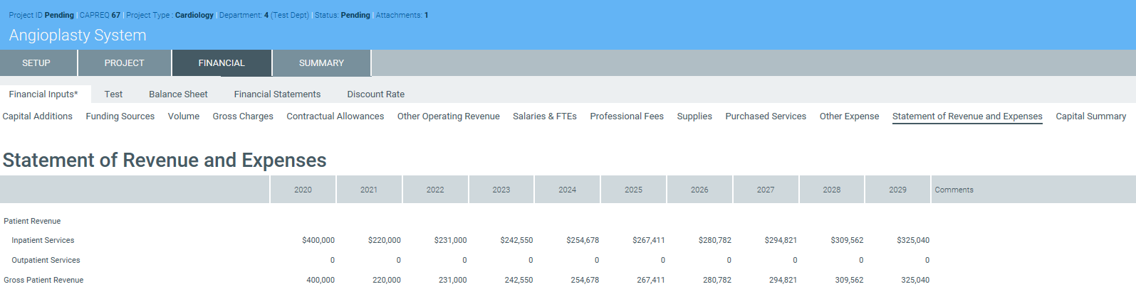 Use this tab to review patient revenue, deductions from revenue, and operating expenses for the Financial Inputs tab.