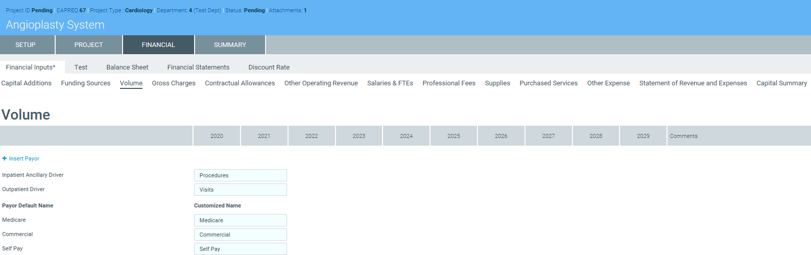 For example, the Total Inpatient Procedures for 2025 is expected to be 1,000. For 2026, the organization expects 1,500. Instead of entering 1,500, the user can just enter 500 in the Volume Adjustment row. This allows users to easily adjust volume amounts without having to enter totals for each year.