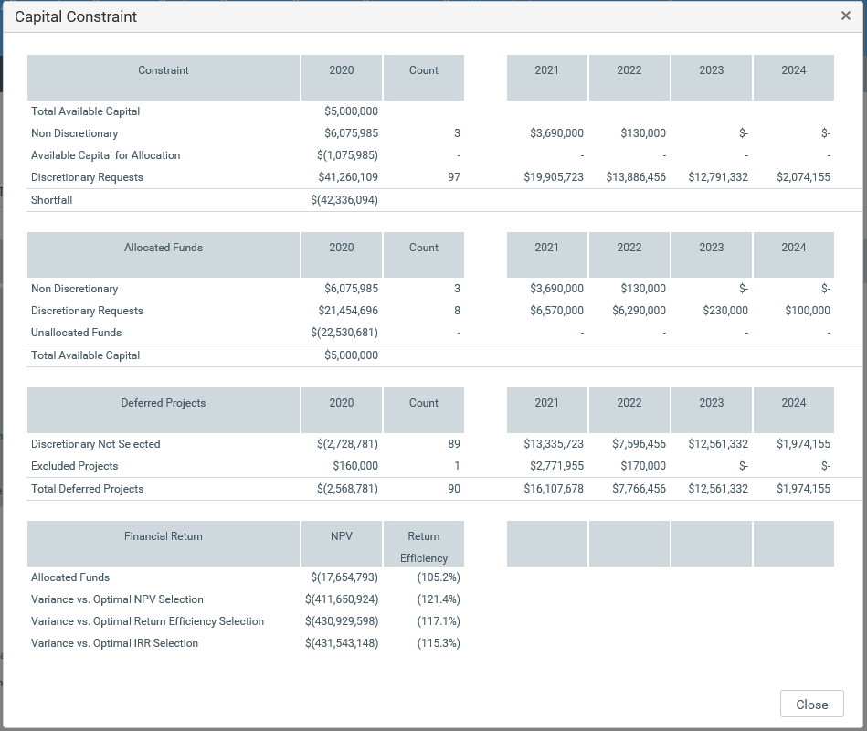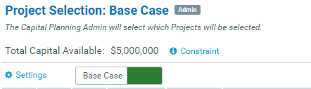 To view a financial summary of the budgeted project dollars, click Constraint (next to the Total Capital Available area above the Settings button).