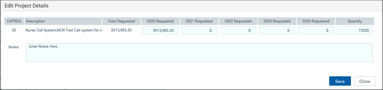3. Edit the project requested amounts as needed, and click Save.