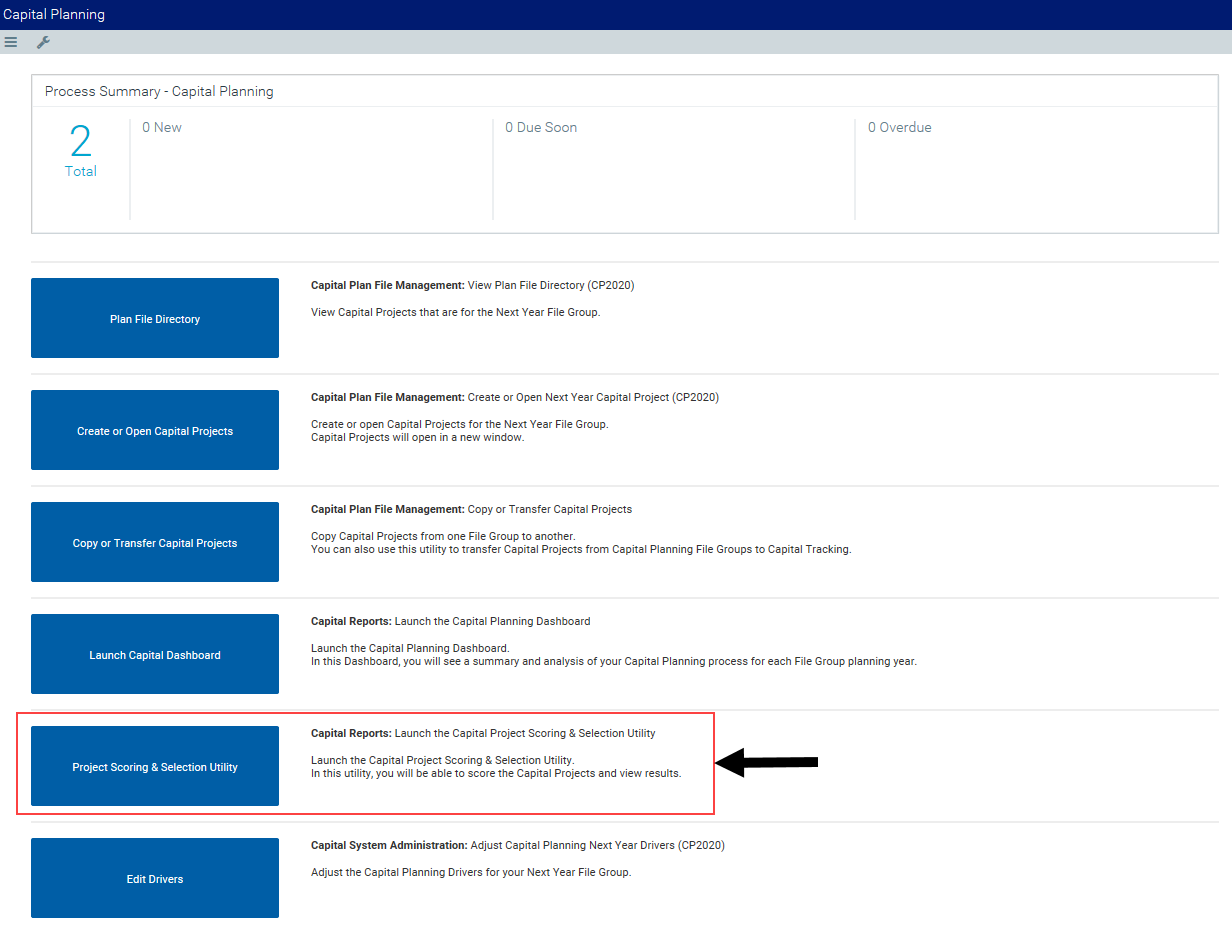1. From the Axiom Capital Planning home page, click Project Scoring & Selection Utility.