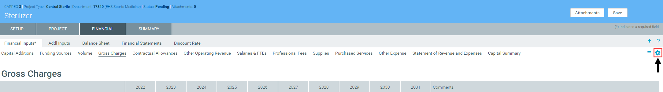 In the Financial Inputs sub-tab, click the gear icon on the right side of the page.
