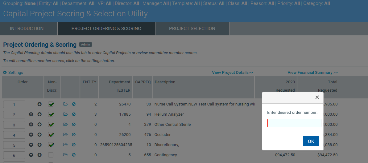 Before you order the projects, you will likely want to narrow down the list of projects to review with the Capital Committee by using the Filter dialog. When you filter the project list, the system will hide the projects that do not meet the filter parameters. The system then places the project in an initial order, which you can edit.