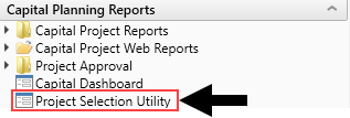 If your organization uses the Windows or Excel Client, in the Cap Plan Admin task pane, in the Capital Planning Reports section, double-click Project Selection Utility.