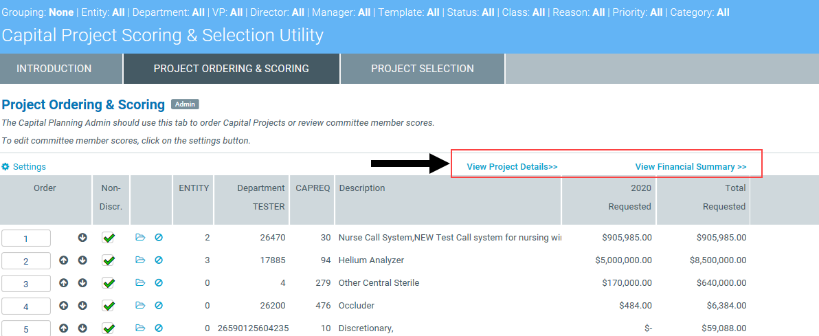 If you are an Axiom Capital Planning administrator, the Project Ordering and Scoring tab in the Capital Project Scoring and Selection utility allows you to configure the order of projects for the Capital Committee members to evaluate. Capital Committee members must be CP Approvers at the time of the scoring sessions. Administrators should also ensure that each team member has the appropriate filters in security to access the Capital Requests being presented in the scoring sessions.