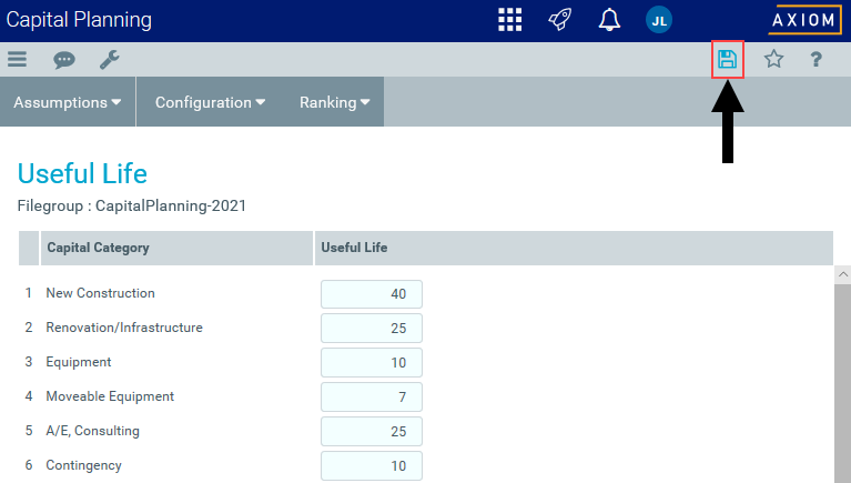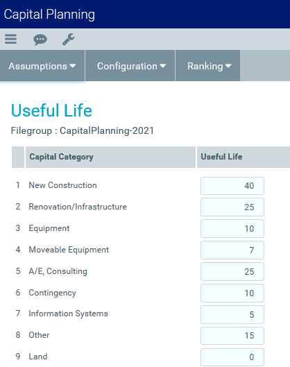 The Useful Life driver lists the average useful life for various types of capital and are primarily used to calculate depreciation. You can create up to 20 different capital types in the Dimensions Update Report on the CODE tab.
