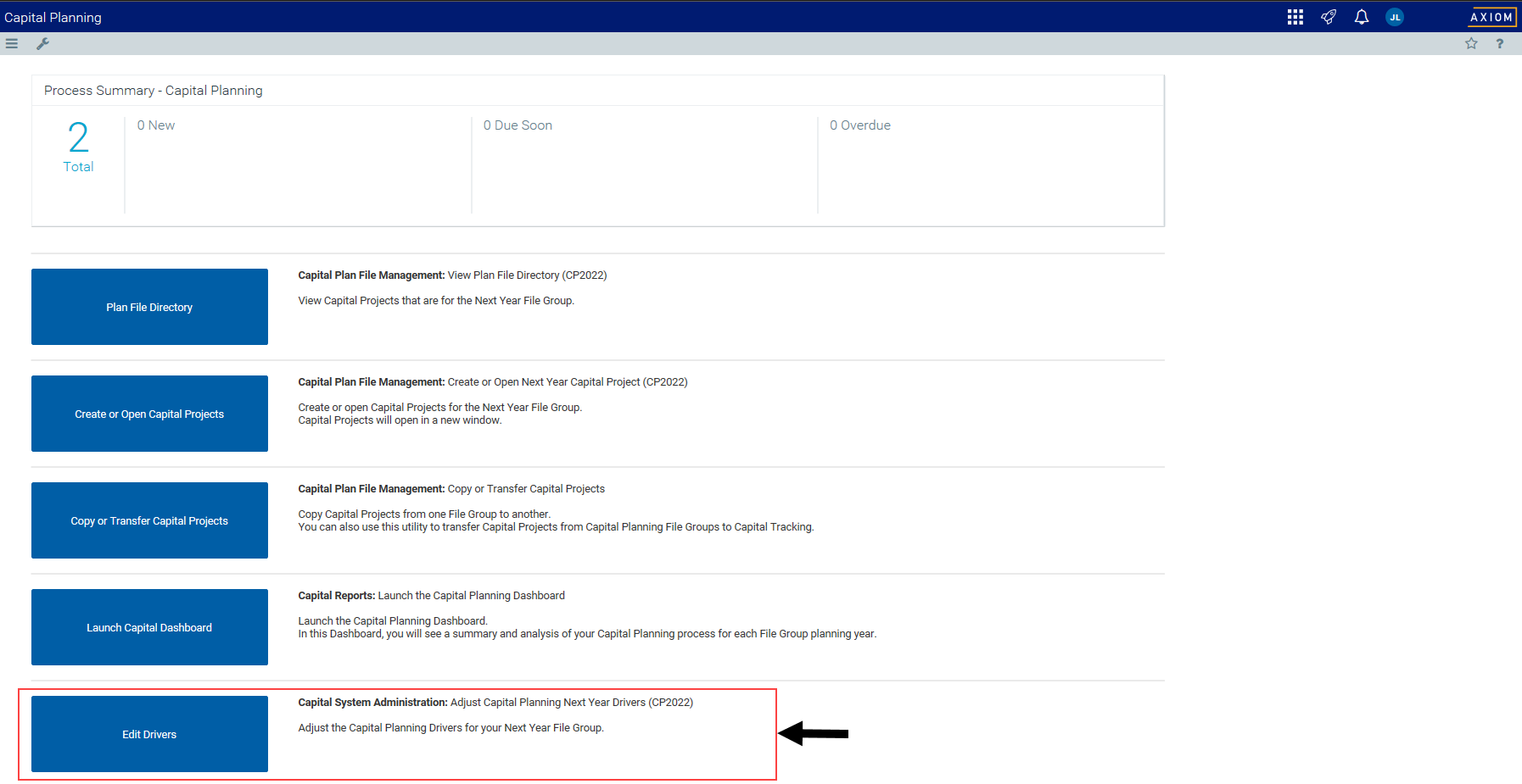 From the Axiom Capital Planning home page, click Edit Drivers.