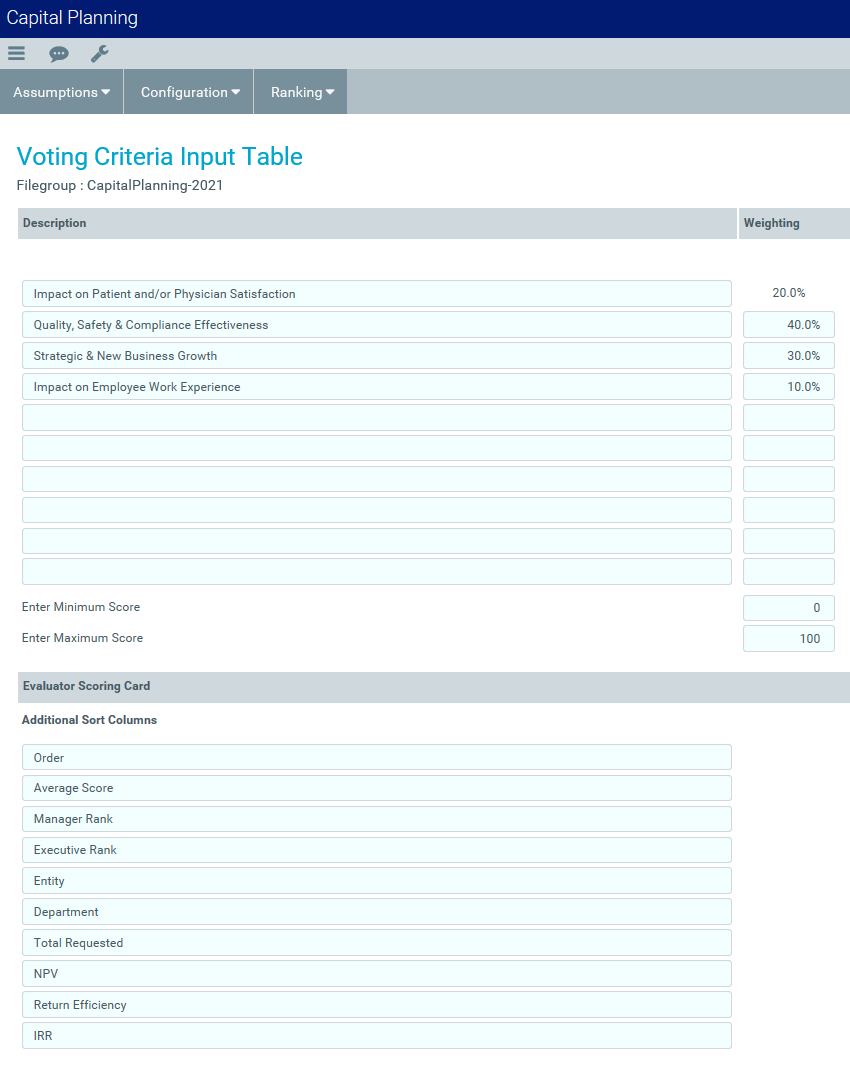 The Voting Criteria Input Table driver lists the criteria on which committee members will be asked to rate projects. Your organization enters the relative weight of each criterion, which adds up to the overall rating for the project.
