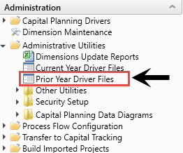To configure the prior year's drivers, click Administrative Utilities, and then double-click Prior Year Driver Files.