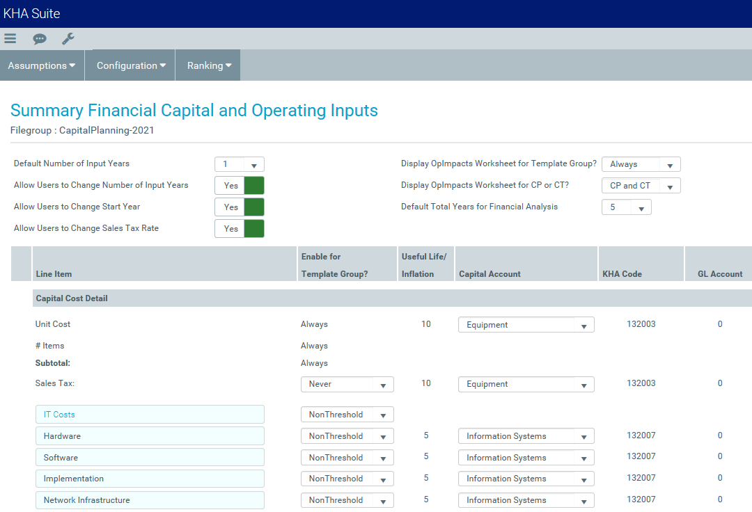 The default Summary template inputs are configurable using the Summary Financial Capital and Operating Inputs driver page. Unlike the Defaults driver page used for the Pro Forma template, there are only two tabs included in the Summary template: Capital Inputs and Operational Impacts. While you cannot remove the inclusion/exclusion default for these sections, you can configure what line items are included in each. You can also select whether to always or never include a line item in a template as well as set other configurations.