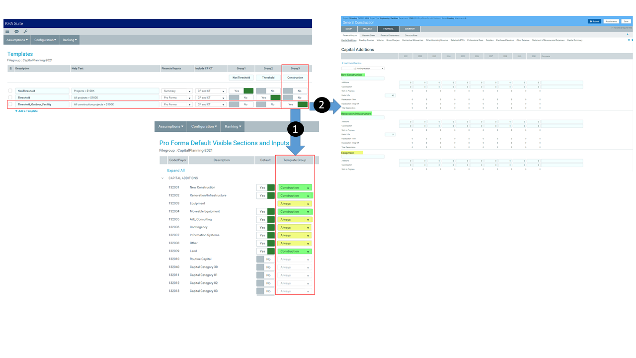 In the following diagram, arrow 1 shows that the Construction template group includes several inputs assigned to it. Arrow 2 shows that when a user creates a project using the Threshold_Outdoor_Facility template, it includes any inputs assigned to the Construction template group as well as the Always inputs.