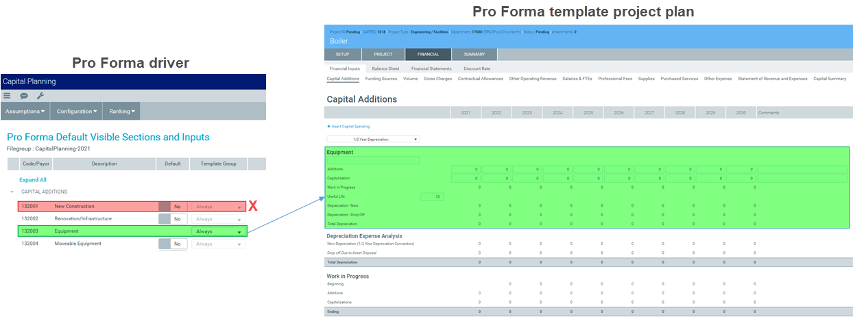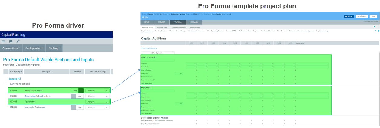 The default Pro Forma template inputs are organized into code or payor sections in the Defaults driver page. For example, all of the codes related to capital additions are grouped together. The same goes for funding sources, salaries, supplies, and so on. Axiom initially sets the default inputs for the Pro Forma template at implementation according to standard best practices, but you can include or exclude sections or inputs from the template by clicking the Yes/No toggle in the Default column.