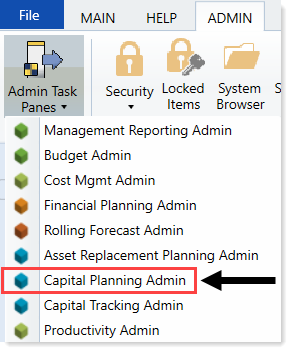 For administrators, in the Admin ribbon tab, click Admin Task Panes, and select Capital Planning Admin.