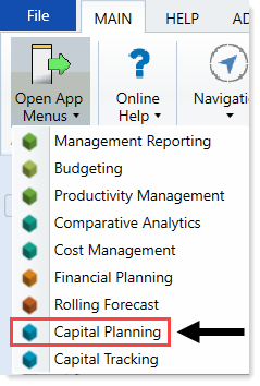 For end users, in the Main ribbon tab, click Open App Menus, and select Capital Planning.