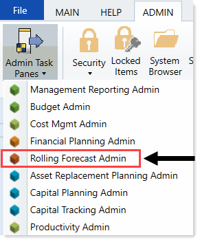 For administrators, in the Admin ribbon tab, click Admin Task Panes, and select Rolling Forecast Admin.