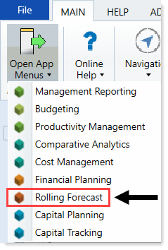 For end users, in the Main ribbon tab, click Open App Menus, and select Rolling Forecast.