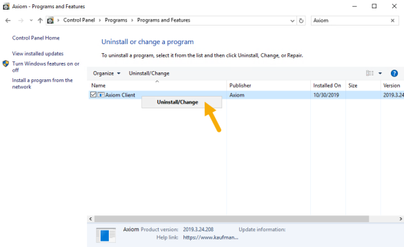 - On the Uninstall or change a program screen, right-click the entry for Axiom Client or Axiom EPM Client, and then select Uninstall/Change. Follow the directions on the screen to complete the uninstall.