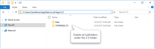 C:\Users\<UserName>\AppData\Local\Apps\2.0. Replace<UserName>with the appropriate user name.NOTE: This folder is hidden by default, but you can access it by typing the path to the folder. Alternatively, you can use the Windows environment variable (