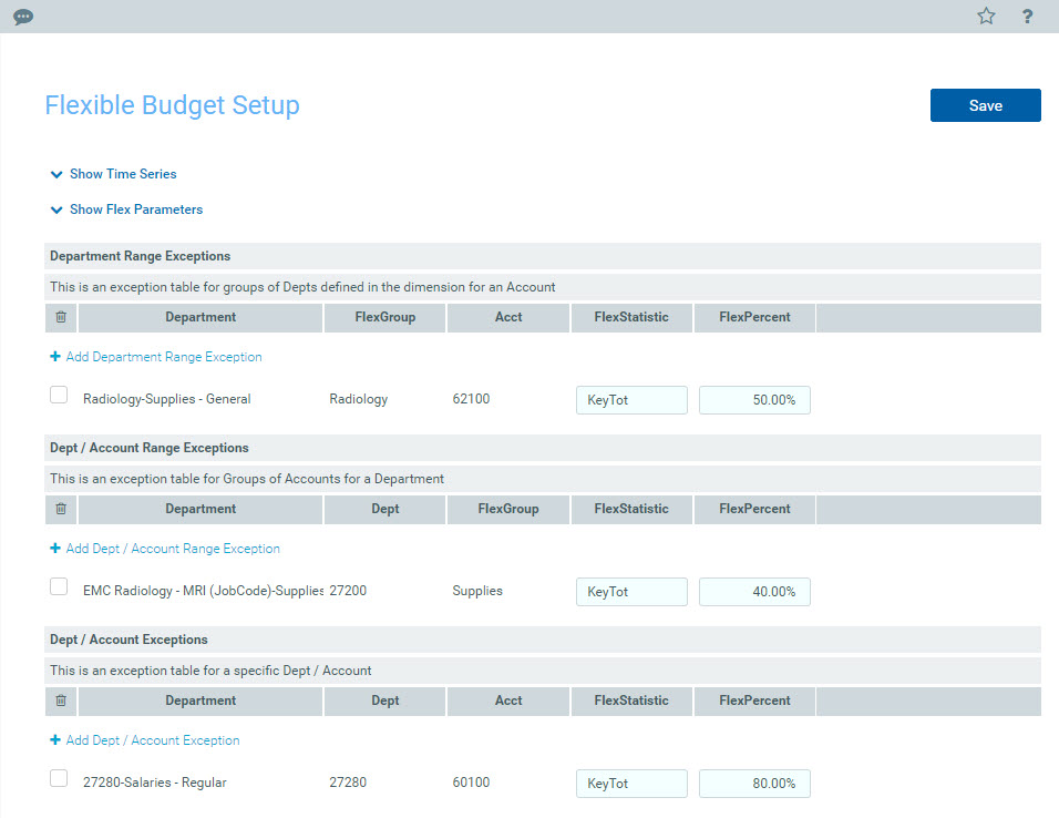 The Flex Budget Setup utility allows you to configure exceptions to override the Dept and Acct flex settings: