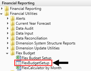 In the Bud Admin task pane, in the Financial Reportingsection, click Financial Utilities > Flex Budget, and double-click FlexBudgetSetup.