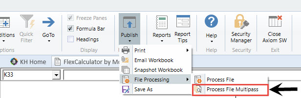 In the Main ribbon tab, in the File Output group, click Publish > File Processing > Process File Multipass.