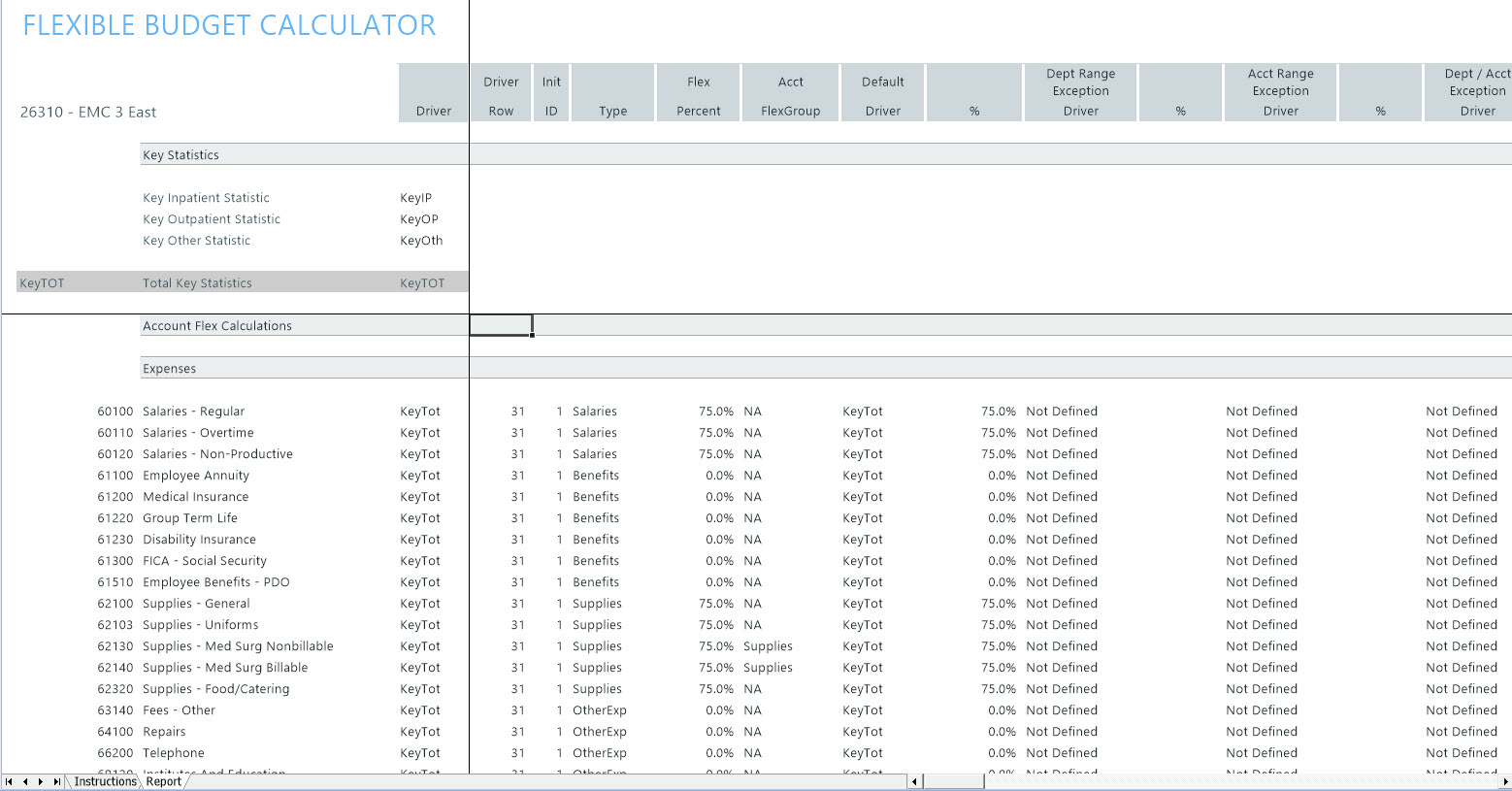 Value Definition KeyTot Total key statistic for the department KeyIP Inpatient revenue key statistic KeyOP Outpatient revenue key statistic KeyOth Other key statistics Stat Acct Number For any statistic account or any account driven by a specific statistic account NA Any account to be excluded from the flex calculations - FlexPercent – Use this to identify fixed or variable percent. You must enter these as a percentage. Set all variable accounts to between 0 and 100%.